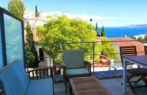 situado en la zona alta de Cap de Ras, con una terraza de 12 m2, equipada con mobiliario de jardín con vistas al mar.