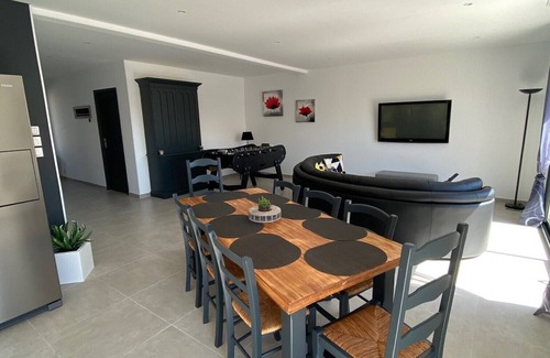 En esta casa de vacaciones de 120m² que dispone de un jardín podrás disfrutar de una playa cercana (con tumbonas), relajarte en la piscina al aire libre o tomar algo en el porche o patio. Para cambiar un poco, entra dentro y ponte a prueba jugando al futbolín, o disfruta del wifi gratis y de la televisión.