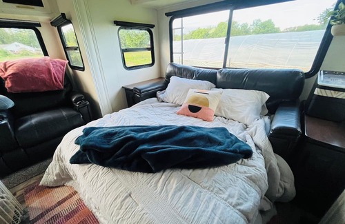 Soak up all of the peace and quiet in home like amenities just outside of the hustle and bustle on this beautiful16 acre property! 2 bedrooms, Comfortable beds, fully stocked kitchen, grill, ample parking, chairs and relaxing. Easy walk to river, off bike path—can bike to campus! 42 foot RV with 4 slides/Stylish and clean! Check out my host reviews for other locations!