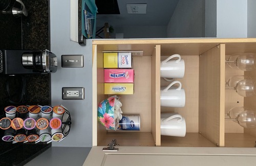 Área de café, té y bar con una variedad de cápsulas de café, crema y azúcar.