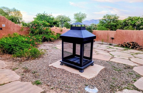 Your Villa is rich with authentic New Mexican architectural features including brick floors, adobe walls, natural light coming from several skylights and bedroom windows, viga wood ceilings, views of the Sandia mountains and kiva fireplaces. These features reflect the ambience of New Mexican lore. The Villa includes laundry facilities. Each bedroom has access to a large dining hall and lounge. Feel free to indulge in our complimentary gourmet snack bar and beverage basket with coffee, tea and cocco for cravings any time day or night. Our snack bar may include gourmet meat sticks, cheese and crackers, assorted nuts, mini muffins, breakfast bars, oatmeal, grits, assorted jams and jellies, chocolates, popcorn, gluten-free options, assorted fresh fruit and other goodies. A large comfortable couch and two dining tables with total seating for 12 guests and phone charges are also included for your convenience. The bedrooms also have access to a lovely private garden patio with views of the Sandia mountain range and an outdoor dining table with a sun umbrella. A large hummingbird garden is nearby as well, complete with an outdoor fireplace and a seating area. The enclosed outdoor kitchen is perfect for an alfresco dining experience, including gas grilling and saute stations, a refrigerator, a bar and sink, a five-function oven, an electric cooktop, a George Forman, a microwave, a crock pot, a large slice toaster and an outdoor dining table with seating for up to eight guests.