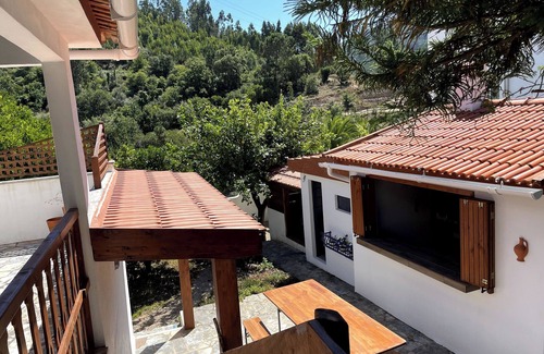 Casa Namaste is a special place in the mountains with spectacular views, hiking and biking trails, river beaches and a quaint village a short walk away. A place to totally relax and get acquainted with the peaceful, beautiful Portuguese countryside, and small village life. All that and still close to A-13, 30 minutes from Coimbra, 1 1/2 hours north to Porto, and south to Lisbon. 1 hr. from the ocean beaches. Casa Namaste is set up with a separate upstairs and downstairs, and an outdoor kitchen/barbeque. Upstairs has a full bathroom, two bedrooms, living room and kitchen. The downstairs has two bedrooms, full bath, kitchen and dining room, with an outdoor dining area. Free street parking. Many fruit trees on the property. You are welcome to pick any fruit in season. Lemons, oranges, persimmons, and figs are delicious! There are great country restaurants with-in 15-20 minute drives. There is an amazing river beach with restaurant 15 minutes by car, 1 1/2 hours hike. Breakfast on the balcony in the morning is amazing with the view of the local village and mountains. Evening sunsets are also spectacular with the colors of the Eucalyptus trees and mountain scenery.