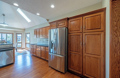 5 minutes to College World Series and downtown Omaha. 5 large bedrooms and 4 bathrooms with 3 separate living spaces. Large primary suite w/ full bathroom king bed and jacuzzi tub, separate den on main floor could use our air mattresses if choose, washer/dryer and 2 dining spaces, and 1/2 bath. Basement fun has large second suite bedroom with king bed, 3/4 bath, rec room, 80" tv and surround sound, pool table, and dart board, walk out to covered patio, hot tub and lake. Upstairs 3 more bedrooms, a family room and full bathroom.