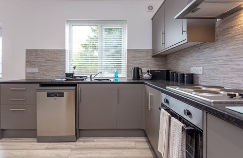 On the ground floor, the entrance leads into a bright lounge with dining space and a separate kitchen, fully equipped with everything you need during your stay — including a fridge-freezer, microwave, kettle, toaster, dishwasher, and washing machine. A convenient downstairs WC is also available. The lounge features a Smart TV and broadband throughout the property, making it easy to work or relax.
