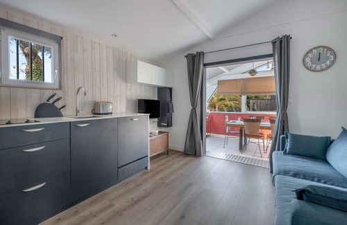 The accommodation consists of a veranda / dining room, a TV lounge with a kitchen equipped with all the necessary household appliances to make you feel at home: double induction hob, extractor hood, oven, microwave, filter coffee maker and Senseo, toaster, kettle. On the sleeping side, you will have a double room (140), a triple room with a double bunk bed (2 x 140) and a bathroom with toilet.