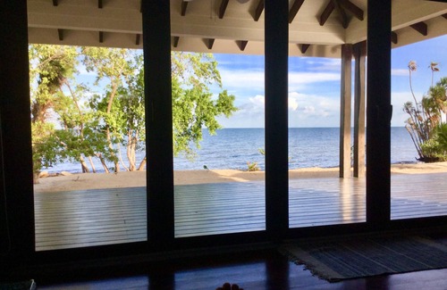 El espacio al aire libre fue diseñado para maximizar la playa y las vistas a la laguna (¡y es bastante sorprendente!). La cubierta de madera cubierta común está cerca de 600 pies cuadrados de espacio de vida exterior cubierto ~ y tiene 70 pies de ancho entre cada cabaña, uniendo y proporcionando privacidad entre ambas cabañas. Hay una gran mesa al aire libre con vista al océano (por un lado y la laguna por el otro), así que nunca debemos perdernos un atardecer o un amanecer.