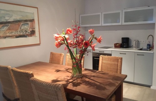 El baño tiene una ducha, el salón-comedor es nuevo y moderno con mesa de comedor, sillas, televisor de pantalla plana, y amplio sofá cama confortable. En el dormitorio es un armario y una cama doble. La cocina cuenta con frigorífico, lavavajillas, cocina y platos, vasos, ollas, hervidor, cafetera. u. V. M. equipada. El apartamento tiene una entrada independiente y estacionamiento. El jardín y la terraza se pueden compartir.