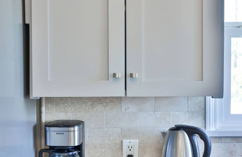 Completamente equipada cocina del chef con una nueva barra de desayuno y 2 taburetes.