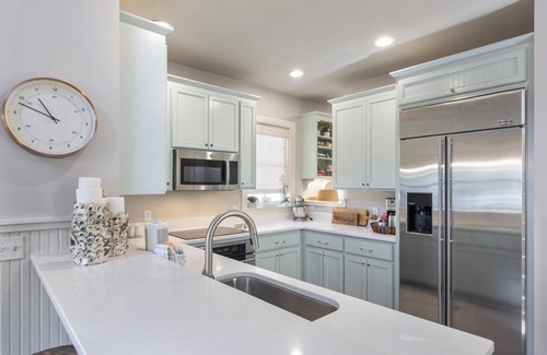 El porche delantero ofrece a los huéspedes una cálida bienvenida y presenta modernas sillas mecedoras Adirondack y una pintoresca puerta de color turquesa. En el interior, una decoración neutra, muchas ventanas y un plano de planta abierto crean un ambiente acogedor y espacioso. La sala de estar ofrece un lugar maravilloso para relajarse con lujosos muebles, un sofá cama doble, una chimenea a gas y un televisor de pantalla plana montado. Los huéspedes pueden disfrutar preparando comidas en la cocina gourmet, que cuenta con encimeras de cuarzo y electrodomésticos de acero inoxidable de élite. El comedor y la barra de desayuno adyacentes cuentan con capacidad para hasta 10 personas y ofrecen acceso al cercano porche cubierto, el lugar perfecto para disfrutar de un café por la mañana y los tranquilos alrededores de Watersound. La hermosa suite principal cuenta con una cama king tapizada, un televisor de pantalla plana y un baño privado con ducha + combinación de ducha / bañera adicional.