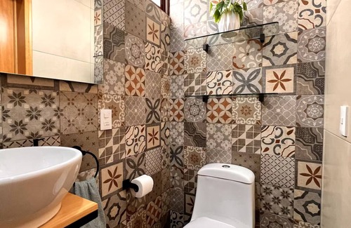 El baño completo con un increíble diseño, cuenta con espejo retroiluminado así como secadora de cabello para tu uso, la presión y calidad del agua es muy buena.