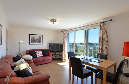 Internamente, el apartamento se beneficia de un área de estar y comedor de planta abierta con puertas que dan directamente al balcón amueblado privado. Aquí puede relajarse y descansar disfrutando de la vista panorámica de la bahía de Falmouth y del mar.