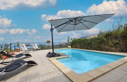 Enjoy a wonderful panoramic view as far as the sea from this comfortable holiday home with pool.
