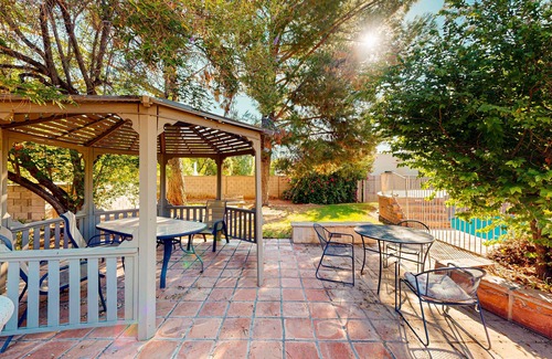 Outside, guests can relax on the expansive property featuring multiple patios, a serene water feature, and a charming gazebo seating area—all surrounded by lush greenery. To top it all off, enjoy a refreshing private pool perfect for lounging and cooling off on sunny days! For wellness and fun, the on-site Casita has been transformed into a yoga and game room, offering a peaceful place for meditation, exercise, or friendly competition. There’s also ample on-site parking to make your stay stress-free.