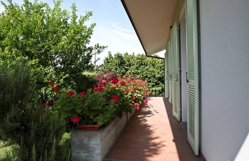 Apartamento en el jardín exterior con maceta de geranios de separación.
