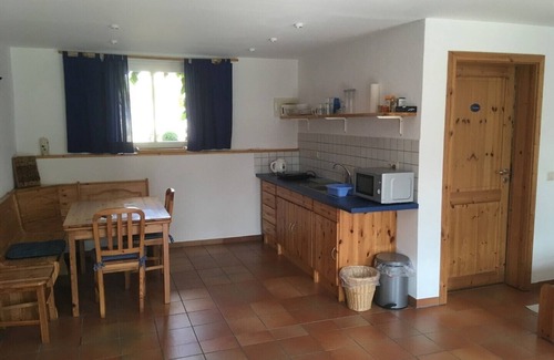 El "Hofstube" consiste en un área combinada de estar y dormitorio con dos camas individuales (se puede combinar con una cama doble si lo desea), una pequeña cocina, un comedor y el baño con ducha y WC. Debido a la entrada a nivel del suelo y la mayor accesibilidad posible, este apartamento también es adecuado para personas con discapacidades.