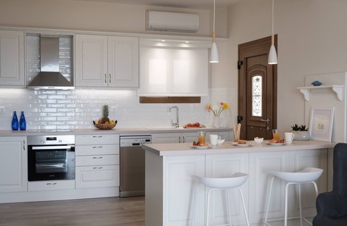 El Armikes Beachfront Suite 1 está situado en Afionas Corfú, cerca de Agios Georgios. Esta suite moderna y luminosa cuenta con una superficie habitable de 50 metros cuadrados en la planta baja de un edificio de nueva construcción a pocos pasos de la playa de arena de Agios Georgios. Armikes Suite puede acomodar hasta tres personas, dos en una habitación grande con cama king size y vista al mar, más una en la sala de estar con sofá cama. La suite de lujo también cuenta con una cocina abierta totalmente equipada con todas las comodidades y una espaciosa ducha con lavadora y gabinete. Una gran puerta acristalada conduce desde la sala de estar a la terraza soleada con impresionantes vistas a la bahía de Agios Georgios. Un gran jardín cubierto de hierba se extiende frente al edificio.