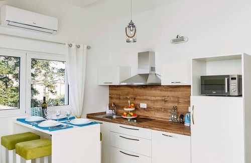 El apartamento estudio Deluxe Bayview, ubicado a 200 metros del mar, ofrece una vista magnífica de la bahía de Tivat. El apartamento está decorado con buen gusto y totalmente equipado con aire acondicionado, TV LCD, WI-FI, nevera / congelador, microondas. secador de pelo, hervidor eléctrico, plancha, tabla de planchar, secadora de ropa, sombrilla, baño con ducha, ropa de cama y toallas limpias, así como toallas de playa ... que le brindan comodidad y todo lo que pueda necesitar para unas vacaciones agradables en Montenegro.