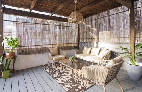 Fantástica terraza de 60m2 para tomar un poco de aire con pérgola, comedor y barra al aire libre. ¡Nuestra parte favorita es sin duda es la zona chill out!. Ofrece unas vistas espectaculares de la ciudad.