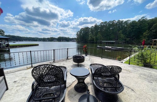 Relax and take in breathtaking lake views from the expansive wraparound porch, where you can enjoy the peaceful surroundings while grilling up your catch of the day. Unwind on the back porch or take advantage of the convenience of a washer and dryer for a stress-free stay. The spacious, modern kitchen and den feature an open-concept design, perfect for enjoying panoramic lake views, complemented by a large dining area that enhances the experience.
