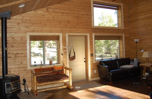 1200 pies cuadrados de paredes interiores de cedro y techo, I. C.F. Construcción con muchas ventanas frente al pie del monte. Elbert. Porche delantero cubierto radiante, construido en 2011. Calor radiante en cada habitación. Baño de azulejos y cocina. Pisos de madera y bonita chimenea de leña. Mucho espacio en un acre completo en Pan Ark Estates con carreteras mantenidas por el condado. 40 'rv pad con conexiones en la parte trasera de la casa (agua de verano). Lavadora y secadora (en verano) cerca de Forebay y Twin Lakes, perfecta para practicar senderismo, motos de nieve y fuera de carretera. Acceso para discapacitados con ducha en rollo.