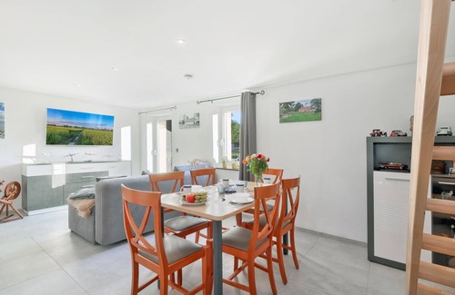 Disfrute de unas vacaciones relajantes y variadas en este apartamento situado en Schmatzin, en plena naturaleza y rodeado de alpacas. El acogedor piso está equipado con una cocina totalmente equipada con varios electrodomésticos. El piso tiene dos dormitorios y un salón muy luminoso y espacioso. El piso de vacaciones ofrece mucho espacio para actividades compartidas, ya sea cocinar juntos, organizar una tarde de juegos o tener una acogedora charla en los sofás. El mobiliario de buen gusto ofrece las condiciones ideales para pasar un buen rato juntos en un ambiente elegante.