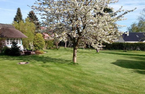 El apartamento de 3 habitaciones de la planta baja se presenta con laminado, el baño alicatado. La sala de estar. u. a. una cómoda zona de estar con un sofá, un sillón cómodo y una otomana y un comedor. Un televisor de pantalla plana está presente de forma natural. En el mayor de los dos dormitorios con vistas al hermoso jardín hay una cama doble (1,80 x 2,00 m) y un armario grande, la habitación más pequeña con una cama farnzösischen (1,60 x 2,00 m) y una muebles de armario. También hay en el apartamento, por supuesto, un cuarto de ducha / WC y una cocina completamente equipada con vitrocerámica y horno, cafetera, hervidor de agua, microondas, nevera-congelador y un montón de platos y cubiertos. Desde el salón se accede a la terraza orientada al sur. Aquí puede tomar sus comidas en la mesa del jardín cuando hace buen tiempo y si no quiere ir a la playa, puede relajarse en sus tumbonas. Las camas están hechas a la llegada, se pueden alquilar toallas si es necesario. En caso de hacinamiento por parte de los huéspedes en los apartamentos, se cobrará un recargo de 10 € por persona.