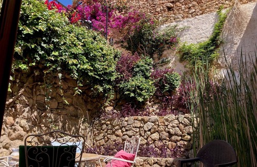 Nos aventuramos al exterior y descubrimos dos patios, uno abajo al que da acceso una puerta desde el comedor. Una escalera de piedra conduce al patio de arriba, amueblado con cómodos muebles de jardín. Un refugio en los meses de verano de la hermosa, pero caliente sol español. En los meses de invierno el patio de arriba ofrece horas de espléndido sol con cómodos asientos.