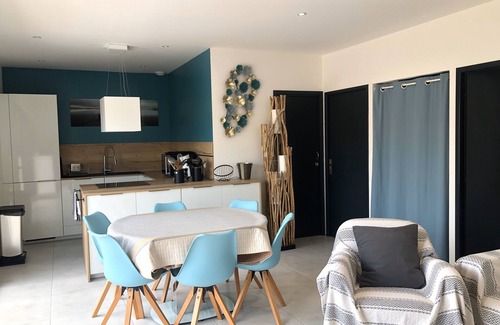 Desde una sala principal con una sala de estar: sofá con cama de 140 X 190, unidades de cocina que contienen toda la vajilla, pantalla plana y aparador bajo. Además, la cocina está totalmente equipada: congelador-nevera, cocina de inducción y horno de pirólisis, lavavajillas, lavadora, cafetera, tostadora, hervidor de agua, etc.