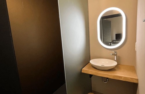 The apartment is fully furnished and features its own kitchen, bathroom, living area and a cosy terrace with a view of the surrounding landscape. Guests benefit from the campsite facilities, such as the tavern, playground and direct access to walking and cycling routes through the Voer region's hilly countryside.