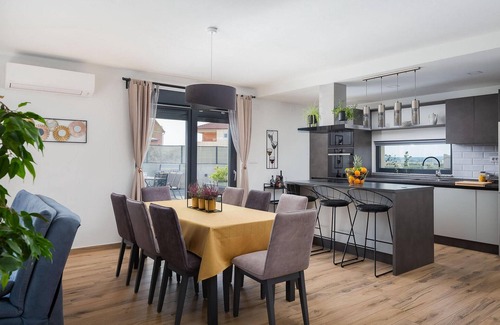 Villa Lacus se encuentra en la hermosa localidad de Vrana, a 12 km del centro turístico de Biograd. Gracias al agradable clima y al paisaje de cuento del lago Vrana, la localidad de Vrana garantiza unas vacaciones de cuento en el mar Adriático. Desde esta hermosa y moderna Villa Lacus se puede disfrutar de una vista de cuento de hadas del lago Vrana. En el primer piso de Villa Lacus hay tres habitaciones con aire acondicionado con baños adjuntos, dos balcones y una hermosa terraza grande. En la planta baja hay un dormitorio con aire acondicionado y cuarto de baño, una cocina moderna con comedor con capacidad para 8 personas y una sala de estar cómoda y espaciosa. Desde el salón se accede directamente al patio con piscina, un garaje abierto con 5 plazas de aparcamiento y un parque infantil para los más pequeños. En el patio, podrá relajarse en el comedor exterior o en las tumbonas alrededor de la piscina (8). También puede servir sus especialidades en la parrilla de carbón exterior. La villa está completamente vallada para disfrutar de la intimidad y la comodidad de Villa Lacus. Cerca de Villa Lacus se encuentra el lago Vrana, el más grande de Croacia y una reserva ornitológica especial. Al llegar al lago Vrana, se alejará de la civilización y encontrará paz en la naturaleza. Si desea disfrutar de la playa y el mar, a unos 12 km de la villa se encuentra la playa de guijarros Janice, que está muy bien equipada con diversas instalaciones turísticas, como pistas de voley playa, barcas a pedales y un parque acuático. No se olvide de visitar la histórica ciudad de Sibenik y el destino turístico más popular de Zadar. En este alojamiento se admiten mascotas a discreción del propietario o por un suplemento.
