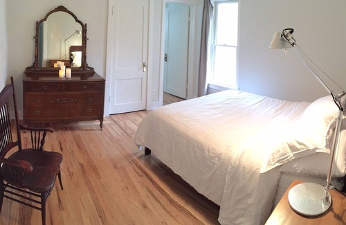 Arriba hay un dormitorio con una cama queen y una cama individual y un baño privado completo contiguo adicional con ducha.