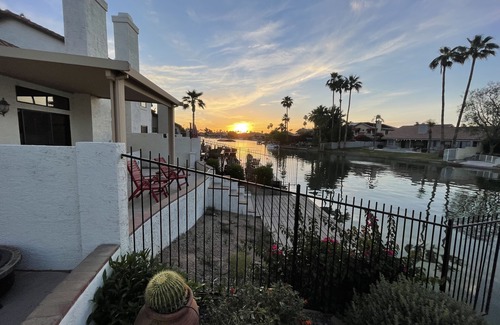 Impresionantes puestas de sol, casa tranquila y pacífica en el lago 2 en las islas en Gilbert, AZ. Dos dormitorios, 2. 5 baños con un altillo con capacidad para 4 personas. Son 2. 9 millas al centro de Gilbert para comida y diversión; 4 millas al distrito del centro de Chandler para más comida y diversión. Camine hasta Starbucks para tomar un café por la mañana o juegue en uno de los dos campos de golf a 4,5 millas. ¡Las compras están en todas partes!