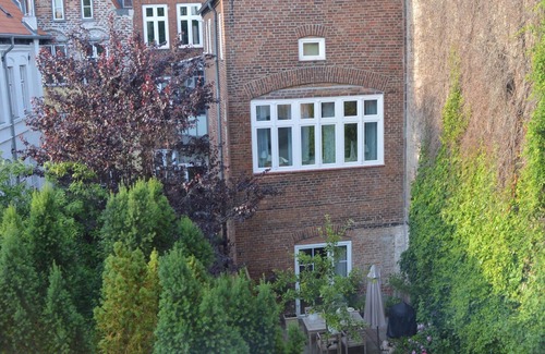 Se encuentra en el patio de una típica casa de pueblo en Lübeck, con una pequeña terraza y justo en el centro del casco antiguo.
