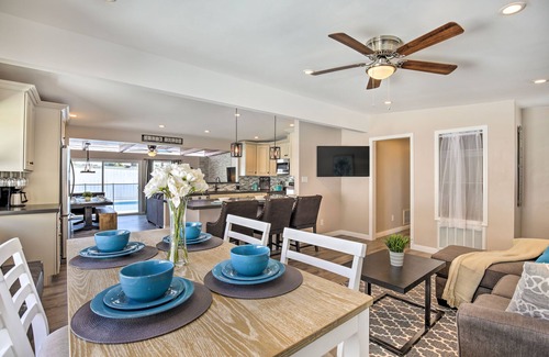 Esta casa de 1,700 pies cuadrados está amueblada tanto en el interior como en el patio para que pueda relajarse con comodidad y estilo. Grandes puertas corredizas de vidrio se abren al área de la piscina, creando un espacio de vida interior / exterior sin costuras.