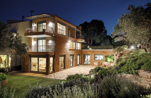La casa tiene 4 dormitorios ensuit -2 en cada planta- con caminar ducha y cada habitación tiene su propio balcón privado con vistas al jardín, bosque y el mar. (Dos habitaciones con cama doble, una con doble y una litera, una con doble y una individual). Todos los pisos son servidos por ascensor. En la planta baja hay un amplio salón, comedor y una amplia cocina. Todas las habitaciones se lavan con luz natural y grandes ventanales con vistas al mar. Casa total de 250m2. Aparte de la casa en la zona de comedor se encuentra maravillosa comedor grande fuera de la cocina con vistas al jardín y al mar. A cualquier hora del día, puede disfrutar del jardín tomando su café o una bebida debajo de un olivo o descansando en una tumbona en nuestra playa de arena casi privada junto al mar. La casa se encuentra en una ubicación única en un pequeño golfo rodeado de bosques, con increíbles vistas al mar a la isla Diaporos, pero por otro lado cerca de pueblos y mercados. La naturaleza mediterránea con los sabores de pinetrees y plantas de hierbas locales como orégano, menta, salvia y thym del jardín harán que su verano sea inolvidable. También hay un huerto orgánico en el patio trasero esperando que pruebes verduras de verano como tomates, berenjenas y pepers entre las plantas de albahaca. Esta es la casa perfecta para relajarse y disfrutar del mar, explorar la naturaleza y la comida local, pero también visitar playas increíbles y bares de playa, probar deportes acuáticos o conducir un bote para una aventura en el mar. ¡Nos encantaría ayudarte a que tus vacaciones sean perfectas!