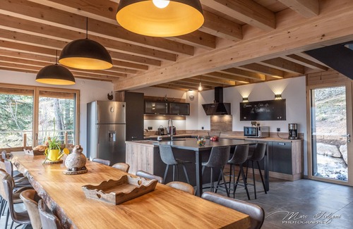 Le chalet "le pourquoi pas" est neuf, exposé plein sud, chaleureux, décoration raffinée autour d'un magnifique et impressionnant chêne, prestations de qualité : un sauna original et rustique, un Jacuzzi extérieur sous abri, une salle de jeux avec billard, Baby -foot, coin TV, un filet, un espace ouvert cuisine séjour et grande terrasse avec vue magnifique, fourneau à bois, espace salon cosy, 5 chambres avec salle de bains privatives . Lingerie équipée. Pourquoi pas venir vous y détendre.