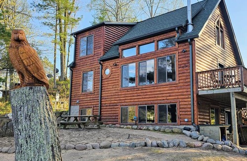 Escape to tranquility, in your family-friendly, private lakefront retreat in the heart of Wisconsin’s Northwoods on Little Sissabagama Lake, near Hayward, Wisconsin. This charming cabin, tucked away on a serene peninsula, where breathtaking sunrises and sunsets greet you daily. Just steps from the water’s edge, enjoy uninterrupted lake views. Wake up to the call of loons, watch osprey soar overhead, and smile as ducks paddle past the dock in the early morning light. Thanks to stunning floor-to-ceiling windows, you’ll enjoy panoramic lake views from the comfort of the great room—bringing the outdoors in, no matter the season.