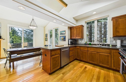 Relax with the whole family at this peaceful home in Shelter Cove. Unwind at the Coastal Canopy, a sunlit, single-story retreat on California's Lost Coast, less than a mile from the Pacific Ocean. Enjoy forest views, high ceilings, a chef-ready kitchen, a large master suite with a jetted tub, and a cozy living room with gas fireplace. Grill on the spacious deck and ocean view, or explore nearby beaches, hiking trails, and local eats like Gyppo Ale Mill and Mi Mochima. Fast WiFi and serene surroundings make this an ideal escape.