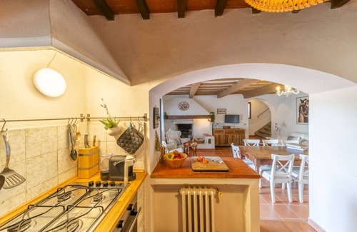 Recientemente restaurada, la casa tiene paredes blancas y techos con vigas y baldosas de terracota. El estilo es el estilo rural simple, típico y original de Chianti.