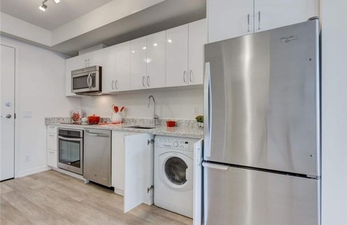 2 habitaciones, 1 baño, capacidad para hasta 6 personas con servicio de lavandería. 1 minuto caminando a la estación de Ctrain. Es un condominio completamente nuevo en un décimo piso, con vista al río y vista espectacular. También viene con 150 Mb de fibra óptica de alta velocidad a Internet y llamadas locales gratuitas. Acceso GRATUITO al gimnasio en la azotea; Tim Horton en la planta principal, acceso al río y parque. También puedes ver el desfile de estampidas desde el patio y caminar 5 minutos hasta el terreno de la estampida.