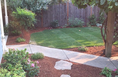 DESCRIPCIÓN: Esta es una casa lujosa y confortable. Dos dormitorios y un baño se encuentran arriba, todas las demás salas de estar (un dormitorio, sala, baño, cocina, sala familiar) se encuentran abajo. Disfrute de vino / café en uno de los porches (hay dos) mientras contempla los jardines o cene / relájese bajo las estrellas en el patio trasero. La cocina completamente equipada se presta para comidas sencillas o suntuosas o puede caminar a los mejores restaurantes de Ashland en A-Street, 4th Street y Downtown. La Ashland Food Co-op está a menos de dos cuadras de distancia. La casa está rodeada de coloridos jardines.