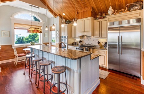 Se puede acceder a los tres pisos de esta casa mediante el elevador de la casa o la escalera interior. ¡La gran casa de 3 pisos tiene un plano invertido! El último piso de la casa tiene la gran sala de estar principal con televisión de alta definición y se encuentra directamente al lado de la cocina gourmet. La cocina tiene un mostrador de comedor, con capacidad para 4, y rincón de desayuno con asientos adicionales. Convenientemente ubicado a través de un pasadizo se encuentra el comedor con muchos asientos para todo su grupo. Hay una mesa de comedor adicional ubicada en el balcón frontal cubierto. El último piso de "Casa Verde" tiene también un medio baño común y una sala de lavandería. El piso superior tiene la Master Suite con vista al mar con acceso privado al balcón con vista al mar.Master Suite # 1 tiene un baño privado completo, cama Queen, chimenea eléctrica y televisión de alta definición. Ubicado directamente al lado de la Master Suite # 1, hay una zona de descanso tranquila y cómoda adicional.