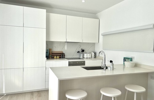 Desde el comedor, puede pasar sin problemas a la cocina adyacente de mármol blanco adornada a mano. La cocina está completamente equipada con electrodomésticos integrados, para satisfacer sus necesidades culinarias durante su estadía. La gran isla en el centro de la cocina cuenta con tres taburetes de desayuno y un tomacorriente convenientemente ubicado, lo que la convierte en un espacio versátil que se puede usar como espacio de trabajo o un lugar de reunión social.