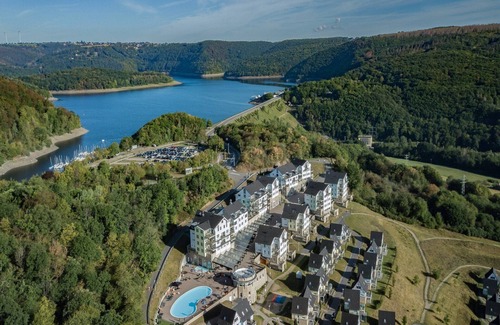 Confort y relajación modernos Este espacioso dúplex en el Eifeler Tor Resort ofrece la combinación perfecta de estilo y confort. Distribuido en dos plantas, cuenta con una luminosa sala de estar con una acogedora zona de estar y comedor, ideal para relajarse después de un día de exploración. La cocina abierta facilita la preparación de comidas en casa, mientras que la sauna privada añade un toque de lujo. Salga a su terraza amueblada y disfrute de las tranquilas vistas del paisaje circundante. Los huéspedes también tienen acceso a las piscinas compartidas, tanto cubierta como al aire libre, juegos infantiles y un acogedor bar. Descubra la naturaleza y la cultura La ubicación del alojamiento en Heimbach le sitúa justo a las puertas del Parque Nacional de Eifel, conocido por sus pintorescas rutas de senderismo, ciclovías y actividades junto al lago en Rursee. Los amantes de la historia pueden explorar el impresionante Castillo de Heimbach y la Abadía de Mariawald, mientras que las familias pueden disfrutar de paseos en barco o avistar la fauna en el parque. La zona también es ideal para pasear a sus mascotas, con amplios senderos y espacios abiertos donde sus amigos de cuatro patas pueden correr libremente. Pruebe los sabores locales En cuanto a la gastronomía, encontrará una combinación de abundantes cocinas alemana e internacional en los alrededores. Disfrute de platos auténticos en el restaurante Klostermühle Heimbach o de las especialidades tradicionales en Zur Krone, ambos muy valorados por lugareños y viajeros. Cenar junto al lago en el restaurante Café am Seehof ofrece impresionantes vistas con especialidades regionales, mientras que los acogedores cafés cercanos son perfectos para un dulce después de una larga caminata.