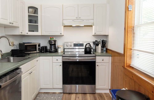 The home is located in the rear of a lot shared with a larger house (also owned by us), it's very private and set well back from the road with a spacious off street parking lot. The interior is open and with lots of windows supplying natural light. The 2 story home has the kitchen, bathroom, and living room on the ground floor, and the master bedroom is located up a single flight of carpeted stairs. The basement, accessible off the bathroom, has a washer dryer available for exclusive guest use.