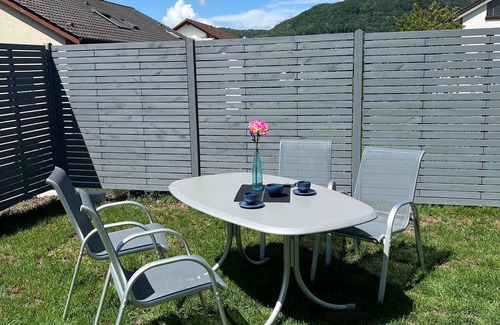 En el jardín podéis relajaros o jugar. Hay un cómodo sofá lounge, una mesa de jardín con sillas para cenar al aire libre y una zona de terraza cubierta.