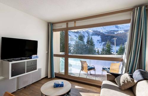 El luminoso salón con televisión y sofá cama para 2 personas da a un balcón con bonitas vistas a la montaña.