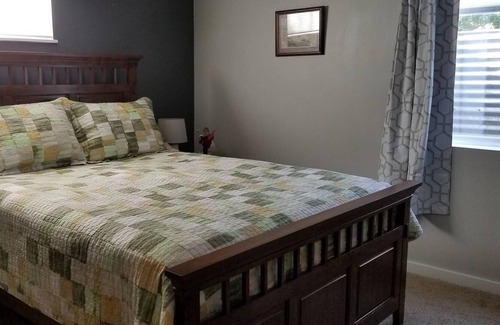 Este es un apartamento de nivel inferior en una casa unifamiliar bien construida que brinda una estadía tranquila. Tiene su propia entrada de teclado privado con mucho espacio de estacionamiento. Hay dos dormitorios, uno con una nueva cama cómoda y la otra con dos camas individuales nuevas. Cada habitación tiene una gran ventana de salida que permite mucha luz natural. Los cómodos espacios con aire acondicionado incluyen una cocina comedor totalmente equipada, WIFI, sala de estar con TV 4K Roku con canales locales por antena. La cocina está equipada con especias básicas, café y té. Un cuarto de lavado con detergente suministrado se comparte con los gerentes.