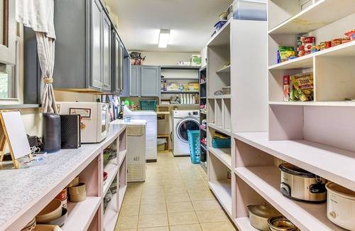 - 3 dining tables, pantry, large pots, serving dishware