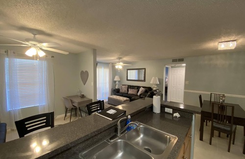 Nuestro espacioso condominio frente al agua es una unidad de 1 dormitorio con den y 1 baño ubicado en la planta baja. La unidad tiene aproximadamente 800 pies cuadrados, un plano de planta abierto, vistas al agua y un gran patio con mosquitero. El dormitorio principal tiene una cama queen size y un vestidor. Hay un televisor con pantalla plana de 50 pulgadas en la sala de estar y tambi��n hay una pantalla plana de aproximadamente 42 pulgadas en el dormitorio principal.